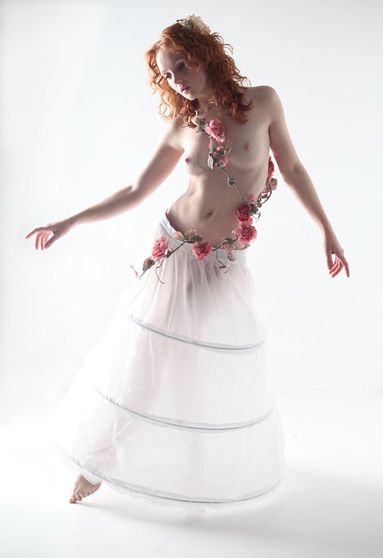 I love these soft, romantic images taken by Keith Cooper at WhiteSpaceStudios in Chesham, just before Christmas. I’d recently bought a transparent hooped underskirt and teamed it with a vine of pink flowers, which I thought could look really cute and dainty. We set up the lighting to shoot at the bright wall behind me, with large bounce boards at the front to reflect at my face and body, whilst the light shone through illuminating my skirt and hair, resulting in a lovely ethereal look.