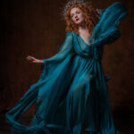 Sheer flowing turquoise gown with wide trailing sleeves